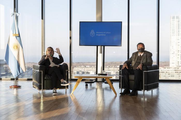 El ministro de Cultura de la Nación, Tristán Bauer, y la presidenta de la Comisión Nacional de Bibliotecas Populares (CONABIP), María del Carmen Bianchi, presentaron hoy a la tarde en centro Cultural Kirchner (CCK) la decimosexta edición del programa Libro % 2021 que, desde el año pasado debido a la pandemia, adaptó su formato a la modalidad a distancia.