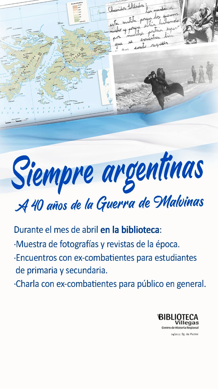 SIEMPRE ARGENTINAS A 40 años de la Guerra de Malvinas. Durante el mes de abril en la biblioteca se llevarán a cabo encuentros con ex combatientes y una muestra de fotografías y revistas de la época para reflexionar y homenajear a quienes fueron protagonistas de esta gesta. La muestra se abre el 1º de abril en horario de atención al público. Para los encuentros, se solicita a docentes e instituciones educativas pedir turnos con anticipación. [Actividad gratuita]