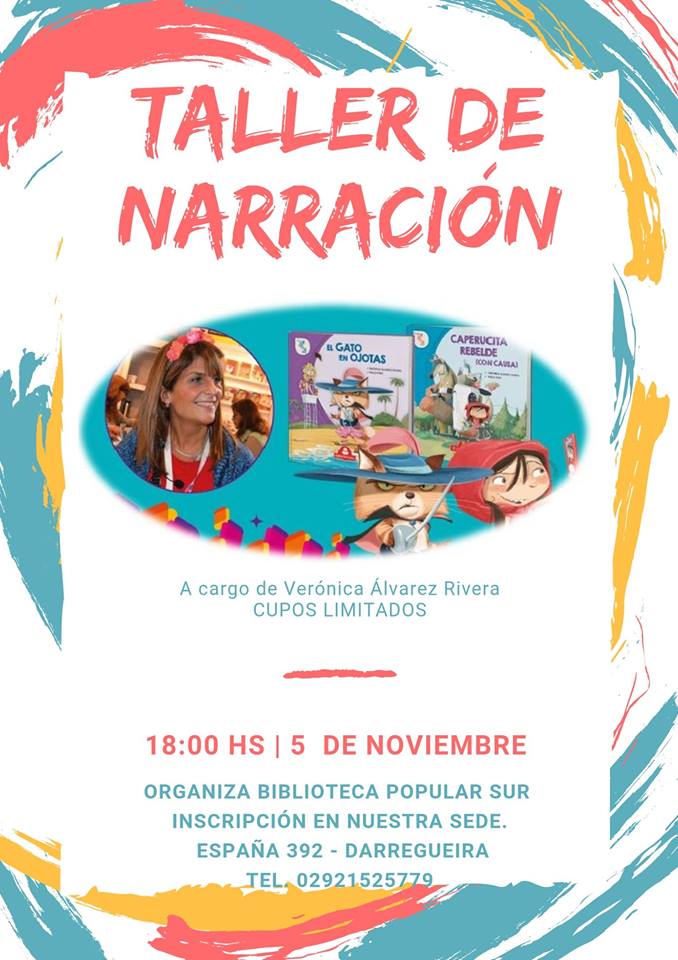 La biblioteca invita a un taller de narración a cargo de Verónica Alvarez Rivera,se realizan las inscripciones de lunes a viernes de 16,30 hs. a 20 hs.