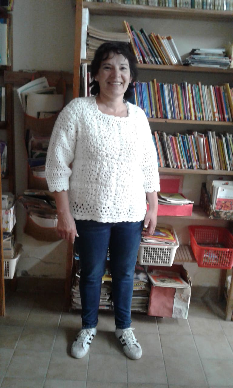 Todos los viernes en el Taller de tejido se realizan encuentros productivos, acompañados de la profe Maria Angélica Ponzoni. Aquí una alumna feliz, con su creación.