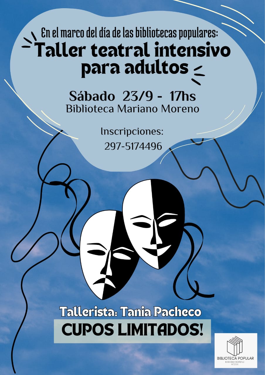 En el marco del día de las Bibliotecas Populares ,23 de Septiembre, los y las invitamos al taller de teatro para Adultos. Con el fin de compartir una tarde de creatividad y emociones, vení a liberar tu imaginación y a jugar, ¡Salite de la rutina y anímate a probar!