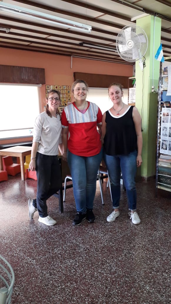 Las profesionales ; Psicóloga, Terapista ocupacional y Especialidad discapacidades; M' Florencia Tehumer, Cecilia Ardover y Florencia Minotti se preparan para realizar trabajos en talleres con personas de la tercera edad en nuestra biblioteca-