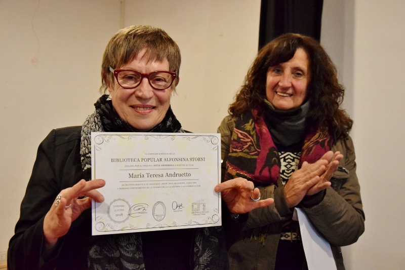 Al finalizar celebramos el encuentro entregando a nuestra queridísima Tere su certificado de Socia Honoraria en reconocimiento a su gran labor como educadora, escritora y persona comprometida con la promoción de la lectura y las justas causas.