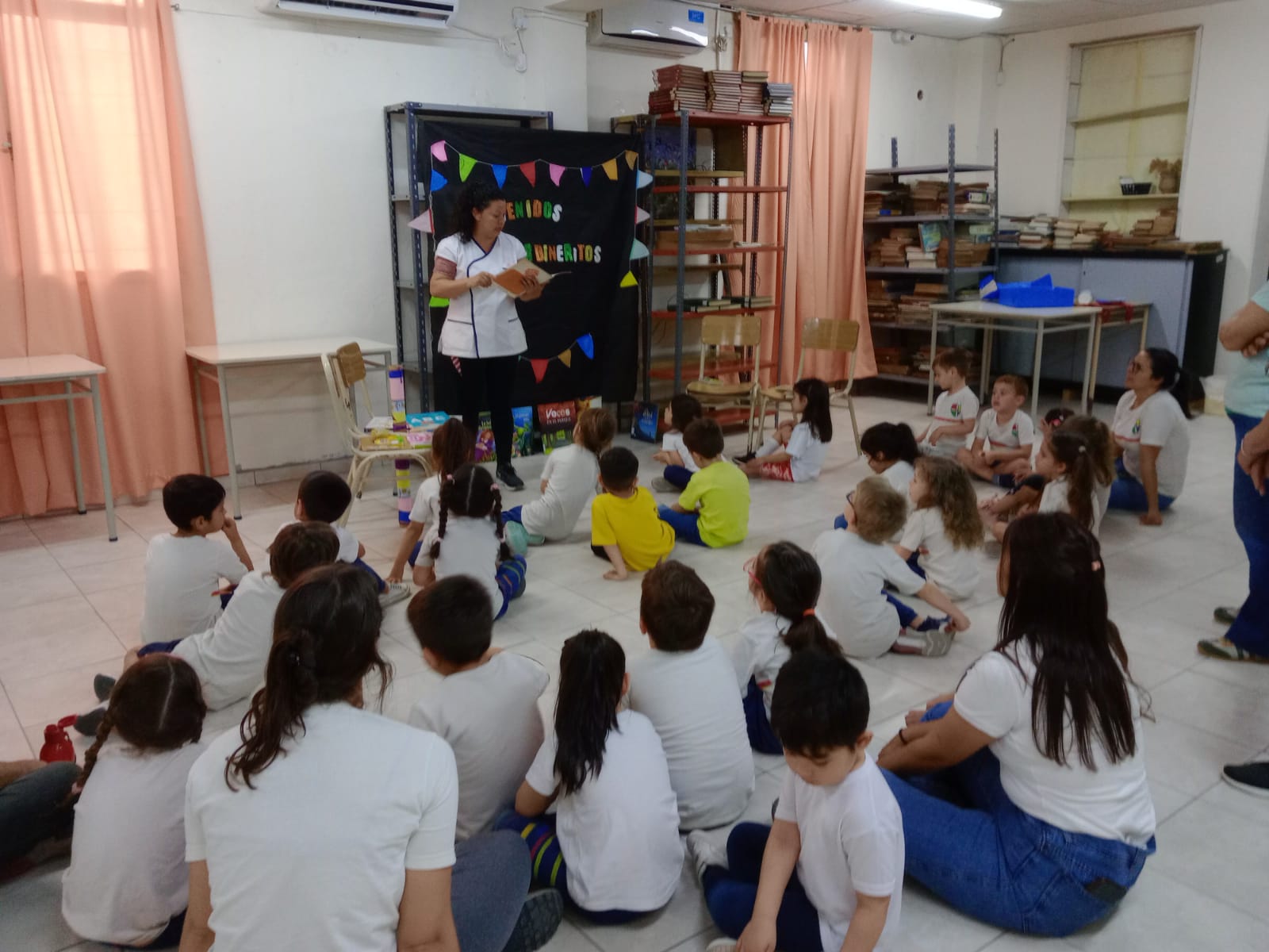 Hoy estuvieron 30 niños de la sala de 4 años del JARDIN Y ESCUELA DE ARTES. Se les leyó cuentos, se les hizo conocer la biblioteca y se les dio libritos para que los miren.