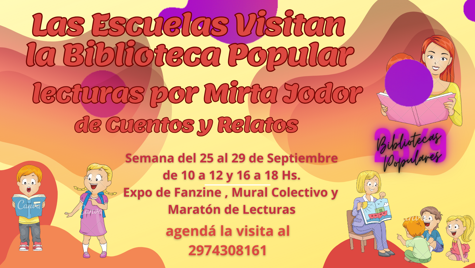 A partir del 25 y hasta el 29 de septiembre las instituciones educativas podrán realizar visitas guiadas a la Biblioteca Popular, donde se realizarán Maratones de Lecturas con los distintos cursos, en el marco del mes de las Bibliotecas Populares, habrá expo de Fanzine, Mural Colectivo, obras fotográficas, pinturas, todos los libros a disposición y podrán disfrutar de cuentos y relatos de la voz de la escritora local