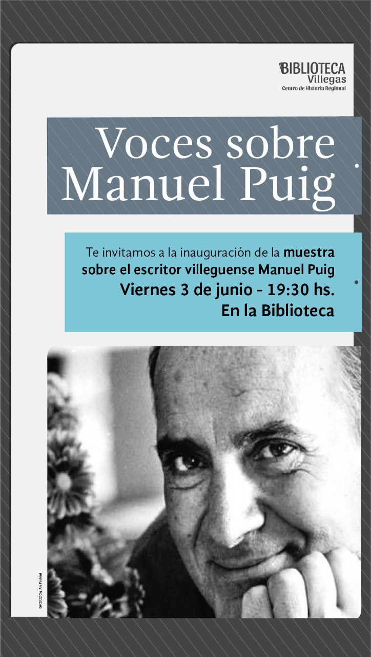 VOCES SOBRE MANUEL PUIG: INAUGURACIÓN DE LA MUESTRA Este viernes 3 de junio a las 19.30 hs el Centro de Historia Regional de la Biblioteca Villegas presenta Voces sobre Manuel Puig, en el marco del 90 aniversario del nacimiento del escritor villeguense. Un recorrido a través de paneles por la infancia y adolescencia de Coco: las voces de quienes lo conocieron, del cine que vio, de los diarios y revistas de la época y de la vida social y económica de entonces. La inauguración de la muestra será este viernes en la biblioteca y quedará abierta para visitas por un mes. ¡Los esperamos! [Actividad gratuita]