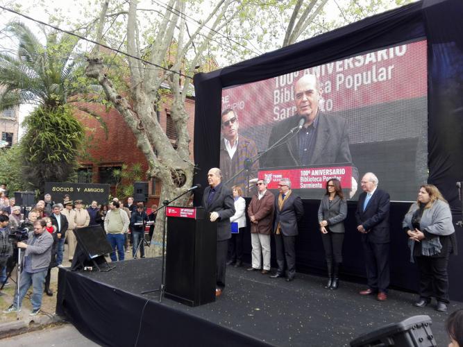 Este miércoles 14 de septiembre la Biblioteca Popular Sarmiento abrió sus puertas desde temprano para festejar sus 100 años promoviendo la lectura. Durante el evento, que contó con la presencia del Intendente de Tigre, el presidente de la CONABIP, de la Federación Bonaerense de Bibliotecas Populares y la presidenta de la entidad, Cristina Rodelli, se repasó la historia de la institución. La proyección de un video que reunió emotivos testimonios por parte de su comisión directiva e integrantes fue un momento destacado. Así como también, el mural de la primera sede de la biblioteca que funcionó en el partido; se intercambiaron presentes y placas en el marco del especial aniversario, en el que también se nombró presidente honorario de la Biblioteca a Luis Zurueta y como cierre de los festejos, el grupo musical "Los Potros" brindó un show musical de flamenco y malambo.