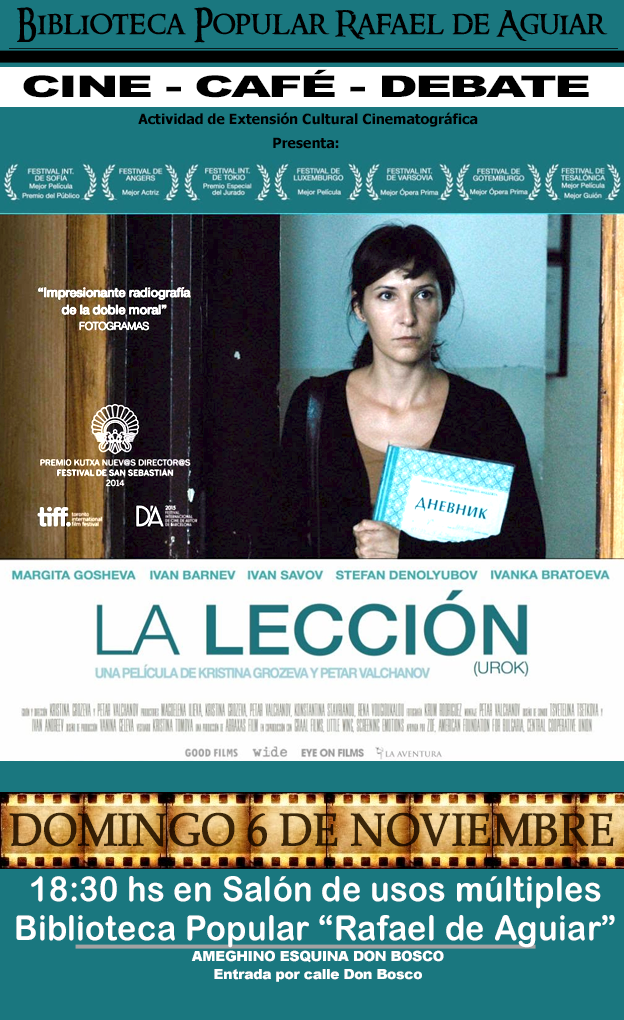 El domingo 6 de noviembre a las 18:30 horas, la Biblioteca continuará con su ciclo de Extensión Cultural Cinematográfica con la presentación del film “La lección” de la Kristina Grozeva. El panel encargado de coordinar la charla está integrada por la Profesora María Eugenia Fiol, la licenciada en Bellas Artes Araceli Marzetti y el Psicólogo Miguel Coca, quienes harán un análisis de la película.