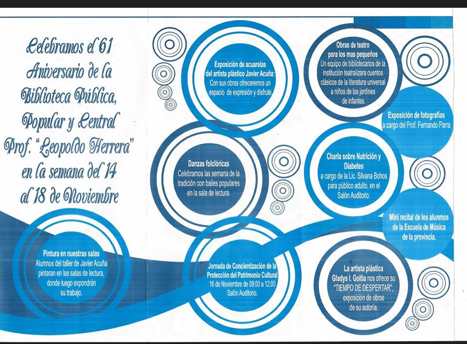 Queremos compartir con su participación las actividades previstas en el nuevo aniversario de nuestra Biblioteca Popular.