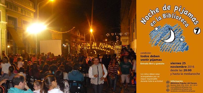La Biblioteca Popular del Paraná organiza, desde hace siete años, una actividad denominada "Noche de Pijamas en la Biblioteca". Las actividades están orientadas a los más chicos, aunque es un momento ideal para compartir en familia, creando un espacio ideal para el acercamiento a los libros y a la lectura. Para llevar adelante dicho evento nuestra Institución cuenta con un gran número de colaboradores y la predisposición de toda la Comisión Directiva, teniendo en cuenta que es una actividad sin costo. El encuentro comienza alrededor de las 20 y tiene una durabilidad de cuatro horas aproximadamente. El éxito obtenido con esta actividad inspira a quienes formamos parte de la Institución a seguir esforzándonos para mejorar año a año. Los invitamos a sumarse este año con el lema de todos los años: ¡vestir pijamas!