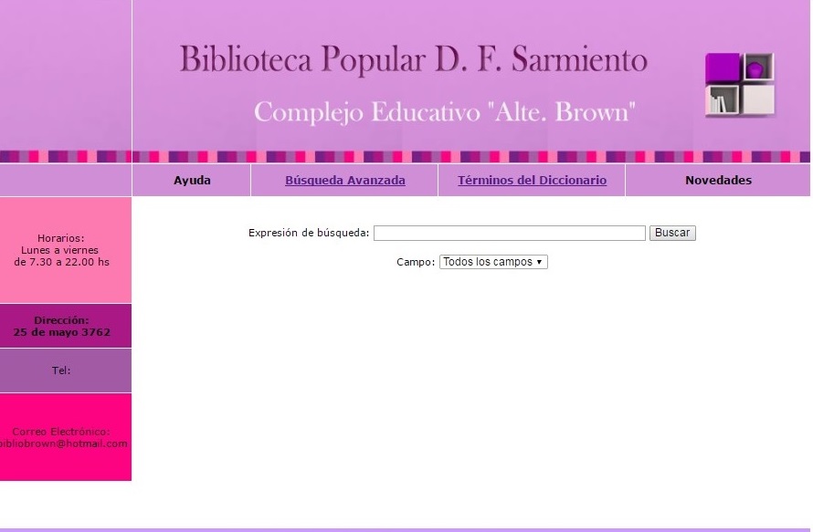 Para enterarte del fondo bibliográfico y las novedades de la Biblioteca, seguí cada paso para visualizar al catálogo a través del siguiente link, www.ispbrown.edu.ar, luego abrí la pestaña de Servicios y clickeá Biblioteca Popular Domingo F. Sarmiento , hacé click en catálogo y listo, comenza con la bísqueda!!!!