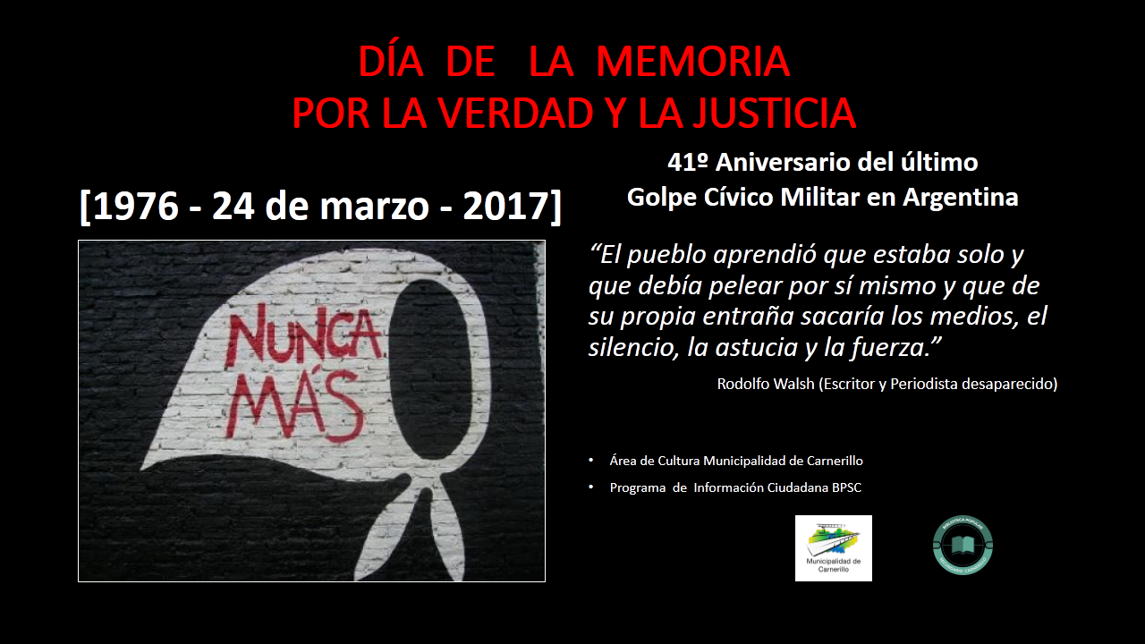 En el marco de esta conmemoración por el Día de la Memoria por la Verdad y la Justicia, la Municipalidad de Carnerillo y la Biblioteca Popular Secundario Carnerillo exponen en la comunidad afiches conmemorativos, arengando al pueblo la necesidad de cuidar el sistema democrático, la libertad de expresión y la reivindicación de los Derechos Humanos.