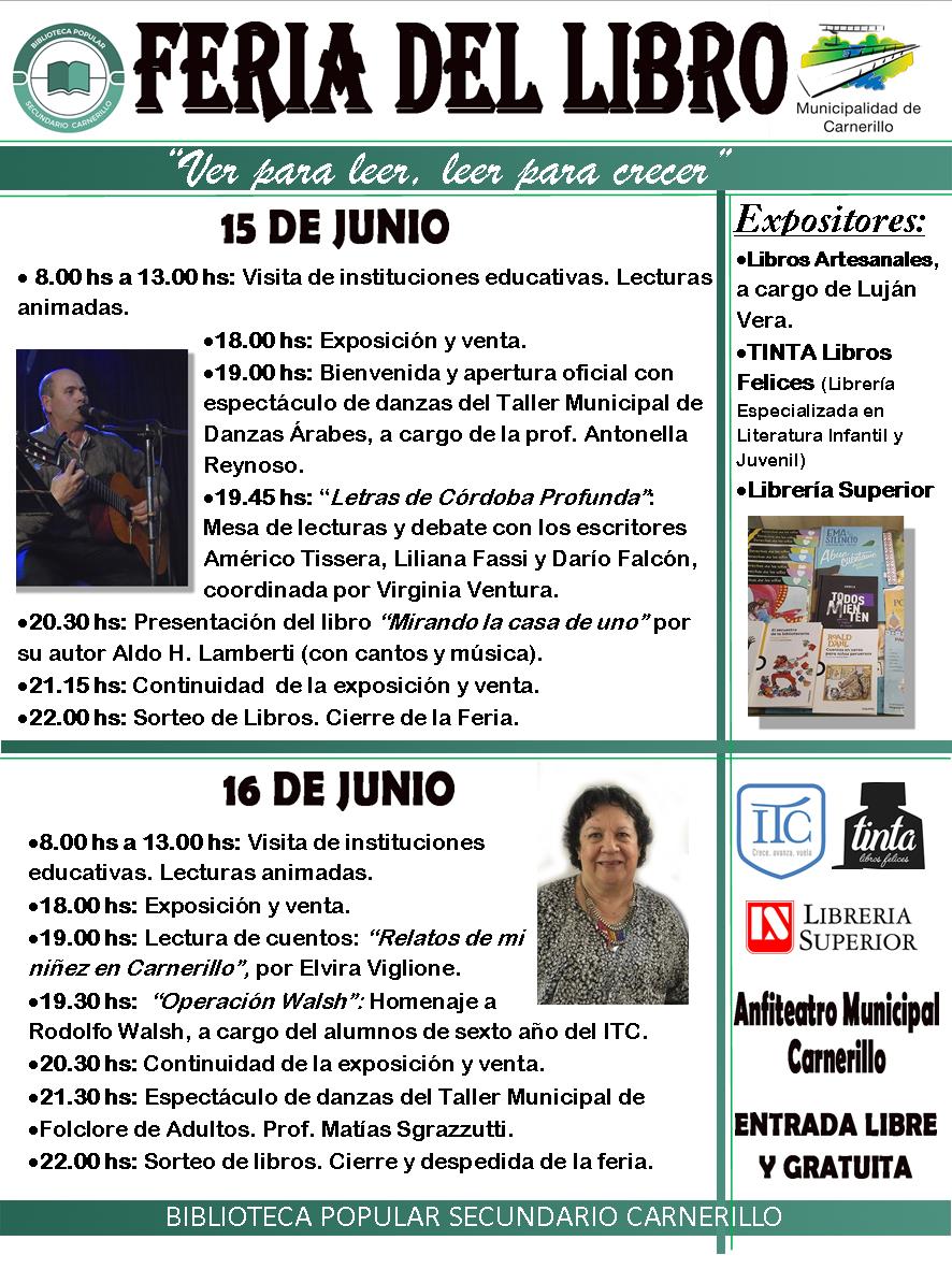 Nuestra Biblioteca organiza nuevamente una Feria del Libro, y este año con el lema: "Ver para leer, leer para crecer". Se presentan diferentes actividades en torno del libro y la lectura par chicos y grandes de la comunidad y la región.