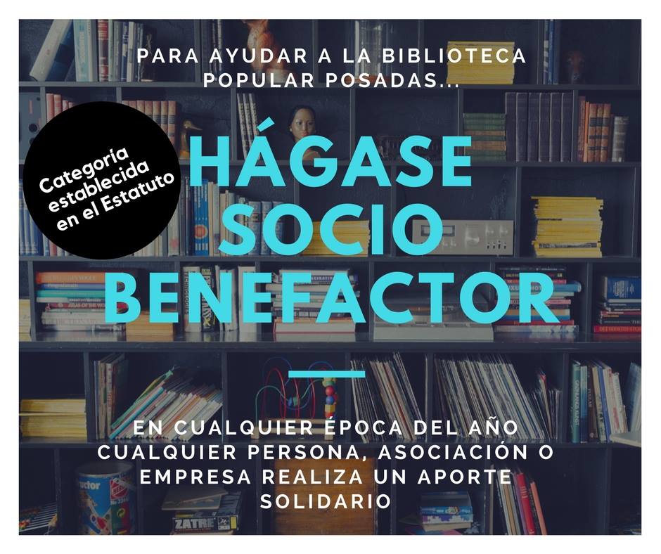 SEAMOS SOCIOS BENEFACTORES DE LA BIBLIOTECA POPULAR POSADAS Existen bibliotecas populares que tienen más de cien años y aún hoy siguen funcionando gracias a que sus asociados, a través de diferentes generaciones, las han sostenido, administrado, cuidado y desarrollado. El proyecto de cada biblioteca popular debería garantizar su continuidad en el tiempo. Por eso es importante que de forma continua se asocien nuevas generaciones. Aunque Existan las estructuras edilicias, los libros y el mobiliario, si no hay socios, no hay biblioteca popular. De los asociados, surgen los dirigentes. Es decir, es el socio el que conforma y nutre a la comisión directiva de una biblioteca popular: primero se es asociado y luego, si existe la vocación y el compromiso, se es dirigente. A su vez, los asociados contribuyen al sostenimiento económico de la biblioteca popular a través de la cuota social que se constituye como un aporte indispensable para su funcionamiento. Se suele pensar que un socio equivale a una persona física que realiza el pago de su cuota individual y, de esa manera, accede a los diversos servicios y actividades que ofrece la biblioteca. No obstante, no existe una única modalidad de asociación. Es así que existen en nuestro Estatuto cinco categorías de socios: Activos, Honorarios, Estudiantes, Vitalicios y Benefactores. Este año la Biblioteca Popular Posadas ha enfrentado una gran inversión en materia de reparaciones edilicias, lo que ha provocado una disminución de los recursos económicos y necesita el apoyo de la comunidad para poder seguir sosteniendo sus variados servicios que son gratuitos (Talleres de Lectura para Niños, Adolescentes y Adultos, Cine para Niños y adultos, Carritos de Lectura, Taller de lectura en el Hogar de Niñas Santa Teresita, uso del salón auditorio para presentaciones de libro, charlas, conferencias, talleres, etc. con un mínimo de aporte, etc.). Es por eso que lanza su campaña de Socios Benefactores. El Socio Benefactor es un asociado que por voluntad propia aporta una cuota extraordinaria sin que esto signifique un privilegio personal (vota por uno, aporta por varios). Es por ello que solicitamos la colaboración de la comunidad, de las empresas y asociaciones y los invitamos a ser socios Benefactores de la Biblioteca para ayudarla en el sostenimiento de sus actividades. La historia de la Biblioteca está íntimamente relacionada a la historia de su comunidad. Por sus puertas pasaron funcionarios de gobierno, docentes, farmacéuticos, ingenieros, obreros, empleados y estudiantes de todos los niveles educativos. Fueron sus dirigentes personalidades destacadas del ámbito local-regional (entre ellos el ex vice Gobernador César Napoleón Ayrault y el escritor Macedonio Fernández, entre otros). Fueron sus socios ,escritores destacados como Juan Enrique Acuña, Horacio Quiroga, Olga Zamboni, músicos como Lucas B. Areco, empresarios como Mola, Núñez, Gibaja, Costa Horianski, Irigaray, Bonetti, Ratti y profesionales como Poujade, Brañas, Bartolomé, Bonifato, etc. La Biblioteca se hizo y perduró en el tiempo gracias al aporte de estas personas y de muchas más que por cuestiones de espacio no las nombramos, pero que próximamente los vamos a integrar en un trabajo que estamos realizando sobre la Historia de la Biblioteca. A ellas que trabajaron desinteresadamente por dotar a la ciudad de Posadas de una biblioteca y de un lugar donde la lectura, la escritura, el cine puedan ser accesibles gratuitamente. ¡A los descendientes de estos socios, a los empresarios y profesionales en general los invitamos a sumarse a la Biblioteca con su aporte solidario!