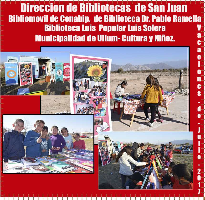 en vacaciones, junto a la direccion de Bibliotecas de San Juan, y el bibliomovil- CONABIP de la Biblioteca Pablo Ramella, con juegos y entretenimientos para niños. jUNTO A NUESTRA BIBLIOTECA POPULAR LUIS SOLERA