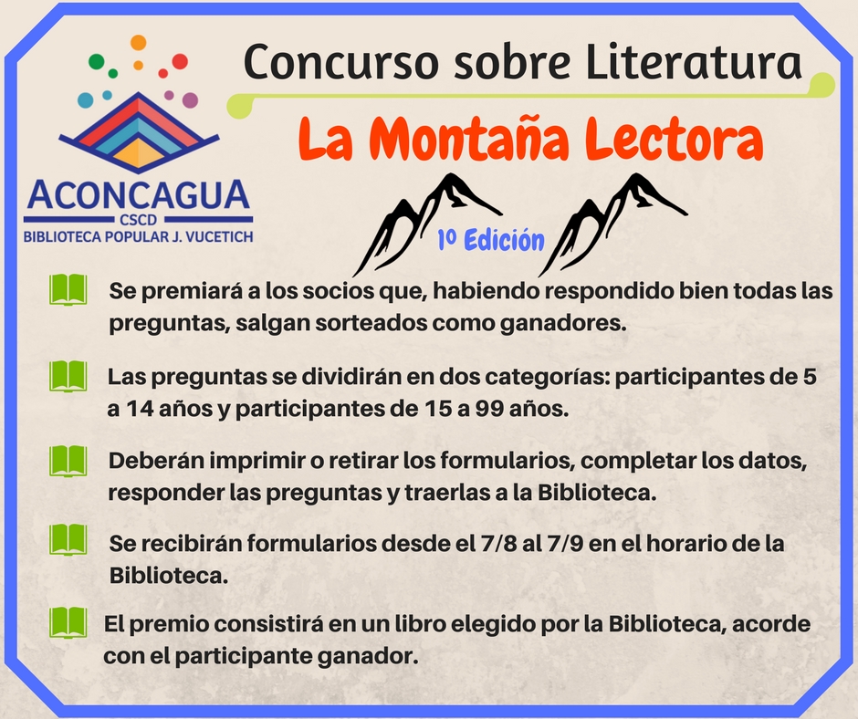 Nuevo concurso de la Biblio sobre Literatura. "La Montaña Lectora" invita a los socios a participar por el premio de un libro a elección de la biblioteca, acorde con el ganador de cada categoría. Los esperamos con sus formularios!