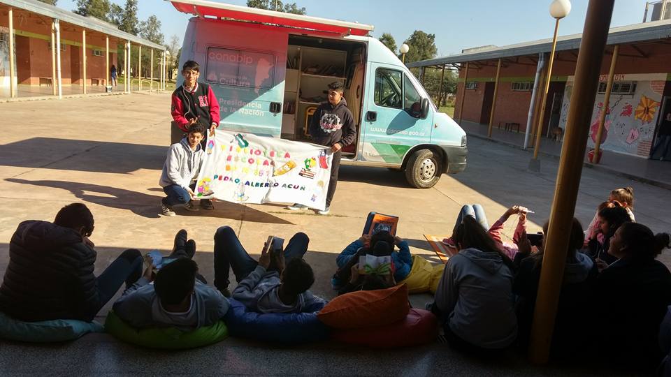 El Bibliomovil visitando la BP N° 357 "Pedro Alberto Acuña" de la E.E.S N° 22 "Víctor Ángel Sartori" de Hermoso Campo, Chaco.