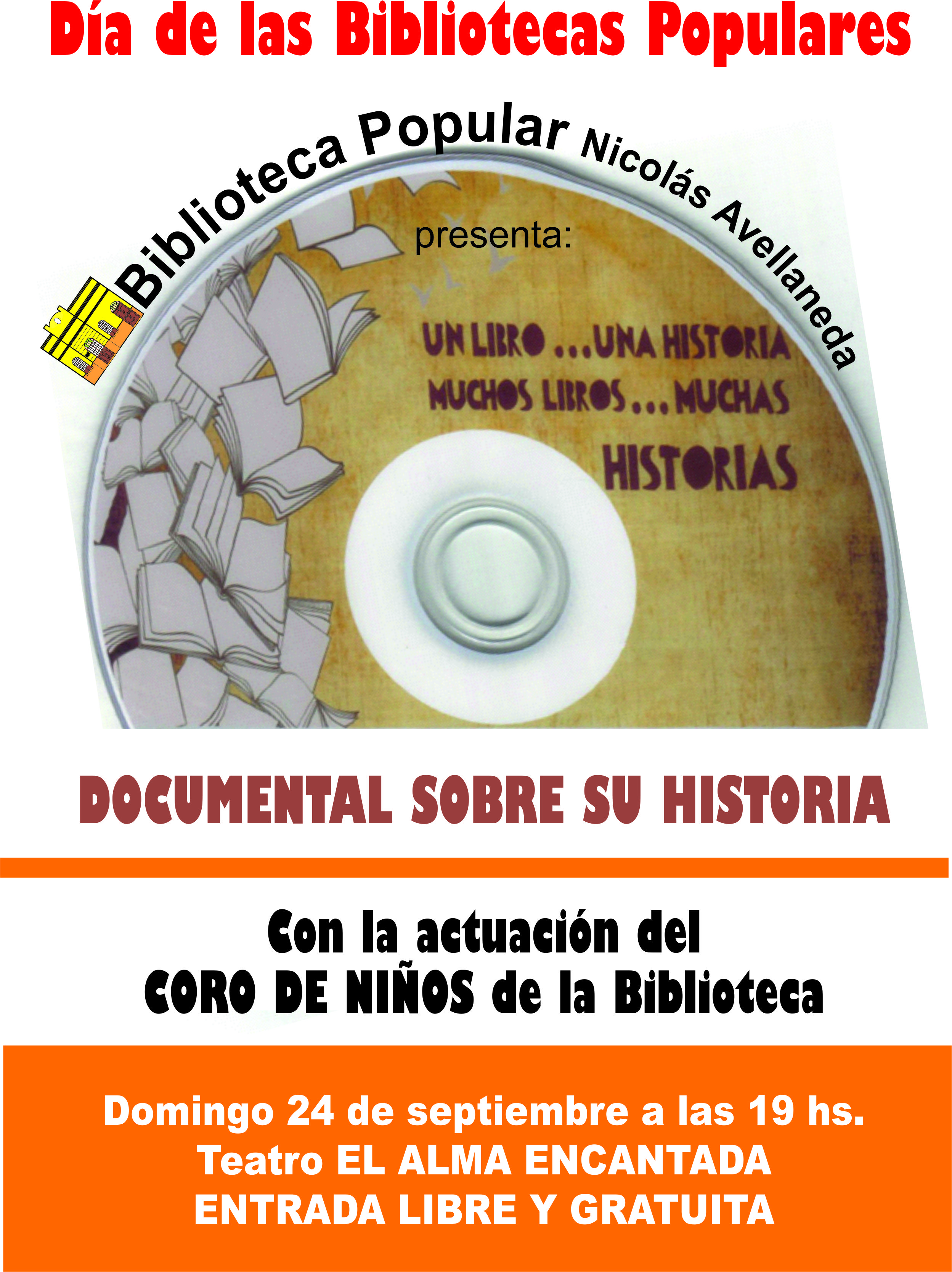El día Domingo 24 de Septiembre a las 19 hs en el TeatroEl Alma Encantada de la ciudad de Cosquin, Provincia de Córdoba, la Biblioteca Popular Nicolás Avellaneda, presenta un documental sobre su historia, realizado por EL CUARTO PATIO, el evento contarà con la actuación del CORO DE NIÑOS DE LA BIBLIOTECA.
