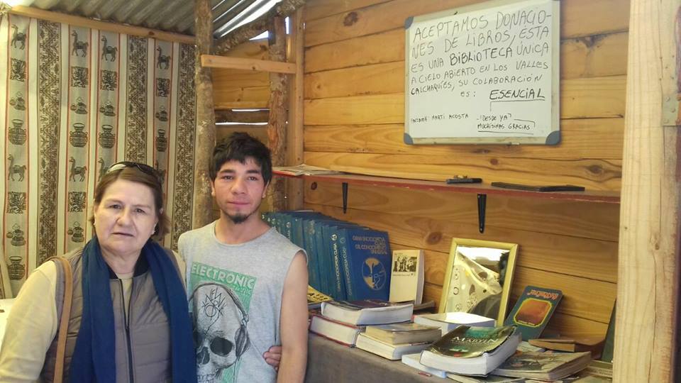 Marti Acosta vive a 40 km del Mirador cuesta del Obispo, Salta (búscalo en facebook para contactarte) desde donde el turista mira a las nubes desde arriba, el "mansamente" exhibe sus artesanías en joyas con un acompañante y coloca los libros para que los lugareños se los lleven, es impactante el paisaje pero lo es mas la actitud d e este joven, pueden enviar donaciones por correo argentino. me impacto encontrar esta biblioteca "sobre las nubes" a 3300 mts sobre el nivel del mar, yo, Maria Luisa dije; después de ver esto yo estoy en un lugar privilegiado en cuanto al acceso y al confort-Gracias Dios!