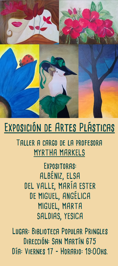 El día viernes 17 del corriente mes a las 19 hs. se llevará a cabo la inauguración de la exposición de Artes Plásticas, taller dictado por la profesora Myrtha Markels en las instalaciones de la biblioteca. ¡Esperamos su visita!