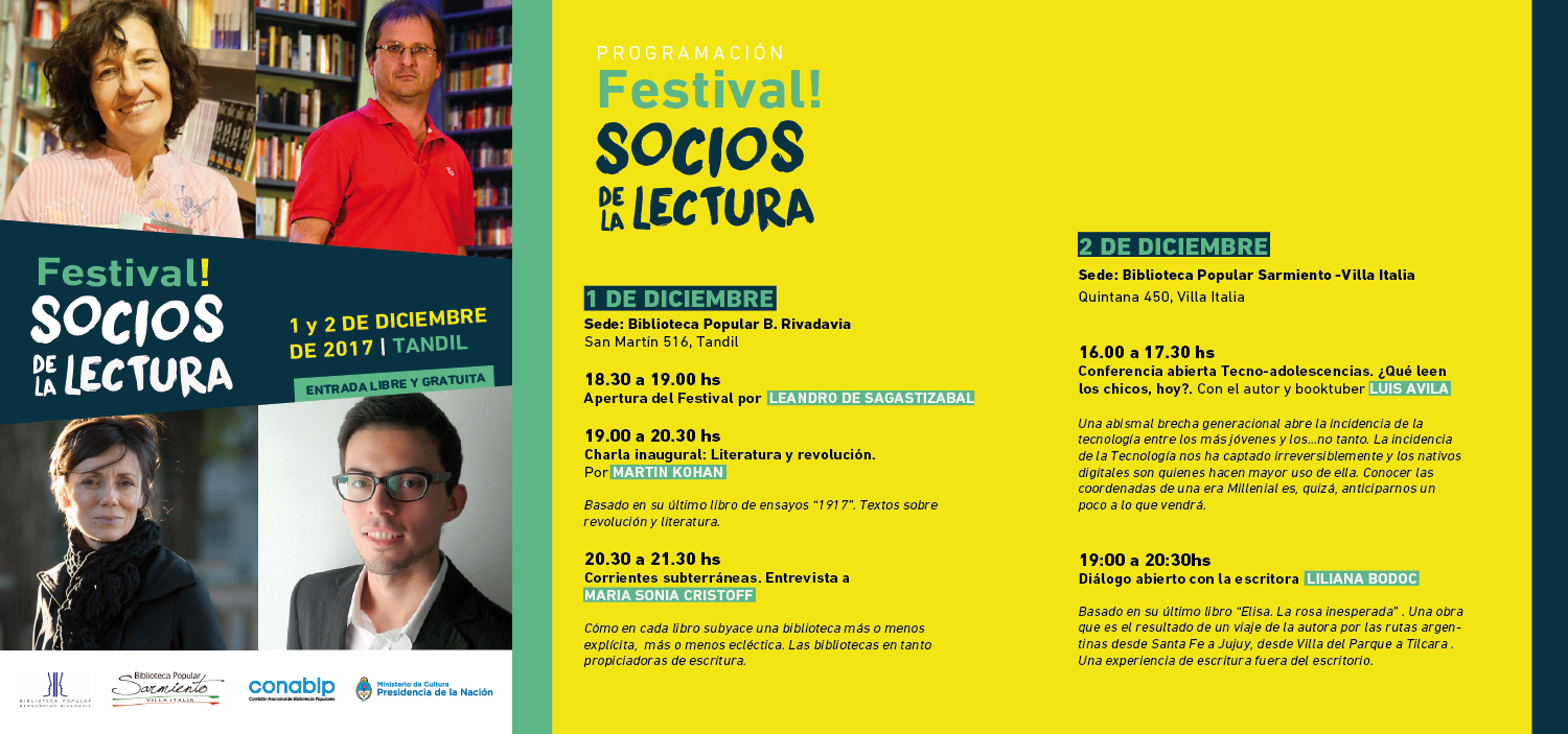 Tenemos el agrado de invitarlos a participar del Festival “Socios de la lectura” organizado por la Biblioteca Popular Sarmiento Villa Italia Tandil y la CONABIP.