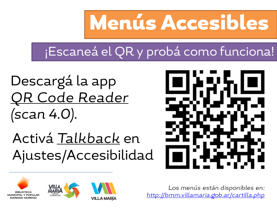A través de un trabajo conjunto entre la Biblioteca y el Ente de Turismo de Villa María, locales gastronómicos de la ciudad cuentan con menús accesibles. Las cartas de parrillas, comedores, restaurantes y bares se encuentran disponibles en una página web creada para tal fin. Se puede acceder a las cartillas mediante códigos QR adheridos a la carta convencional de cada lugar. El código está indicado con relieve. El programa para leerlo direcciona a la página http://bmm.villamaria.gob.ar/cartilla.php que se puede usar con lectores de pantalla. Esta iniciativa forma parte de las acciones que la Biblioteca lleva adelante para promover la accesibilidad a las personas ciegas y disminuidas visuales.