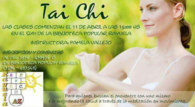 ATENCIÓN!!!!! Comienzan las clases de TAI CHI, el 11 de abril a las 15 hs, en el SUM de la Biblioteca Popular Rayuela, Prof Pamela Soledad Vallejo, Celu: 3576-470936 o al TE:497549 . Los esperamos