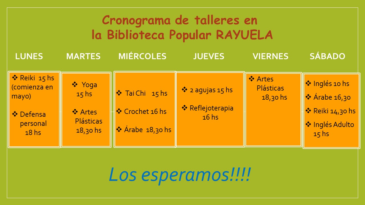 Horarios de TALLERES CULTURALES en la RAYUELA