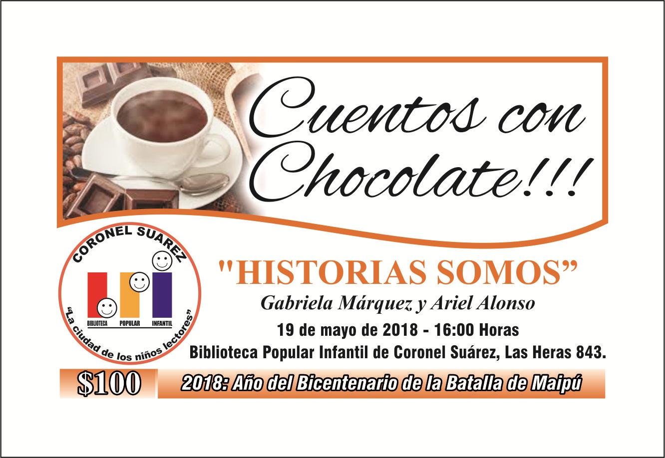 Este año nuevamente CUENTOS CON CHOCOLATE!!! CHOCOLATE CON CUENTOS!!!! HISTORIAS SOMOS 16 horas Gabriela Márquez y Ariel Alonso 19 de mayo. Biblioteca Popular Infantil de Coronel Suárez LAS HERAS 843