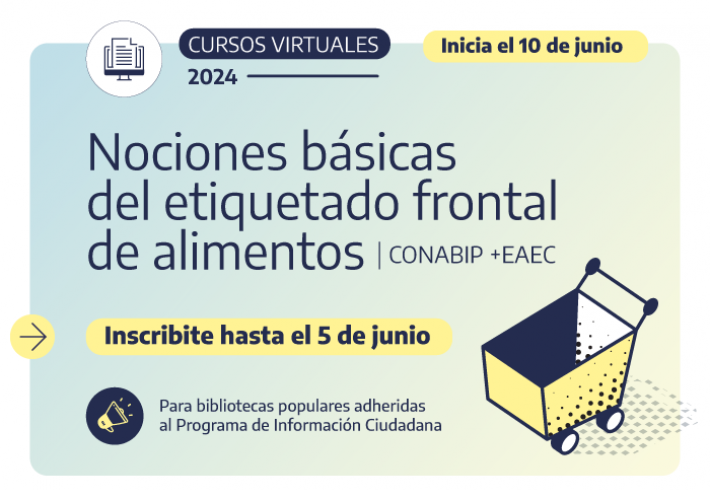 La CONABIP invita a las bibliotecas populares adheridas al Programa de Información Ciudadana a participar del curso virtual Nociones básicas del etiquetado frontal de alimentos, dictado por la Escuela Argentina de Educación en Consumo (EAEC) desde el Campus Virtual CONABIP.